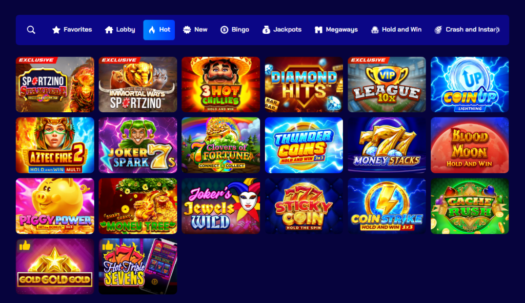 Sportzino is designed to feel intuitive from the moment you log in. Whether you’re looking to play a game, check out promotions, or explore your account options, everything is right where you’d expect it to be. The top menu keeps essential features within reach, while a search bar and categorized tabs make finding games straightforward and quick.