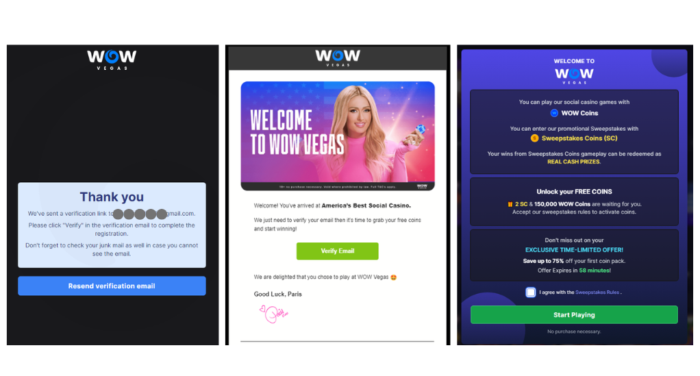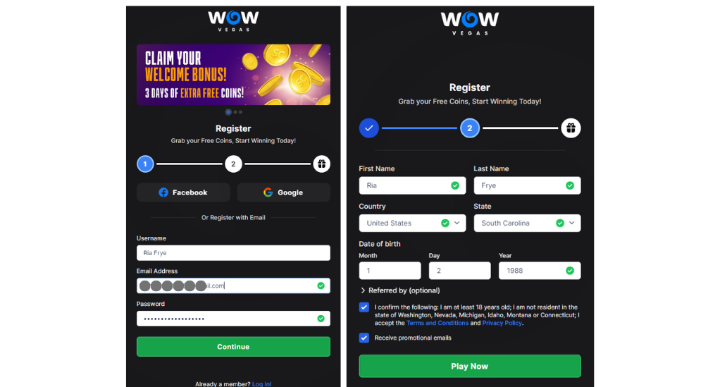 I’ve played on WOW Vegas a few times, and it offers a nice range of promotions. Creating an account was quick and simple. It’s a two-step process: you fill out basic details like your name, username, and password, or you can sign up using Facebook or Google. Once I verified my account through the email they sent, the sign-up bonus was automatically credited, which let me start exploring the platform immediately.